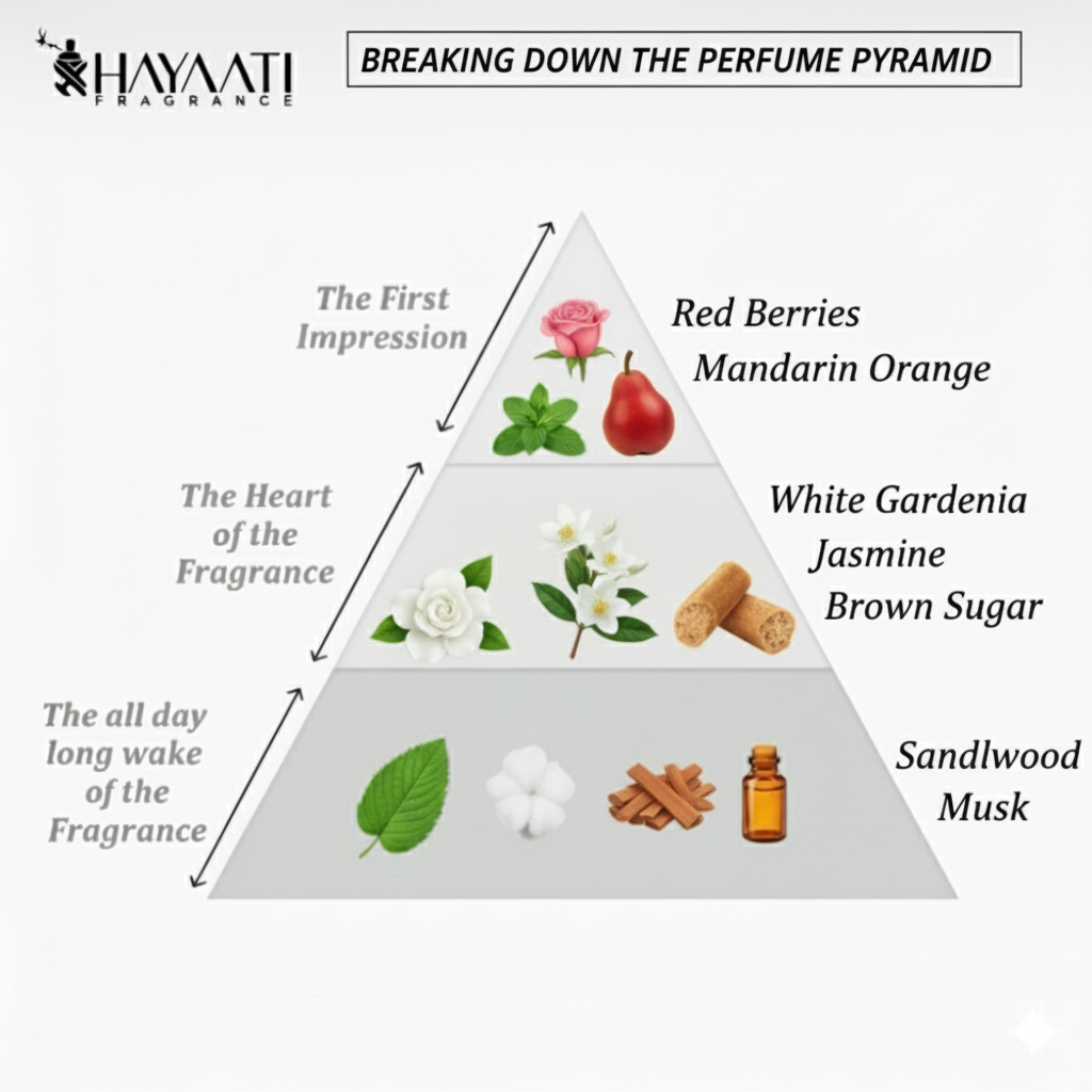 At first spritz, a vibrant bouquet of Blossom Accord melds with bright Italian mandarin, crafting a lively, fruity-floral introduction. The heart blooms into a velvety trio of White Gardenia, rich Jasmine Absolute, and creamy Frangipani—together exuding an intoxicating, heady floral beauty. The dry down reveals subtle sweetness and depth: a tender Sandalwood accord alongside warm Patchouli lends a sensual finish that lingers softly on the skin.
