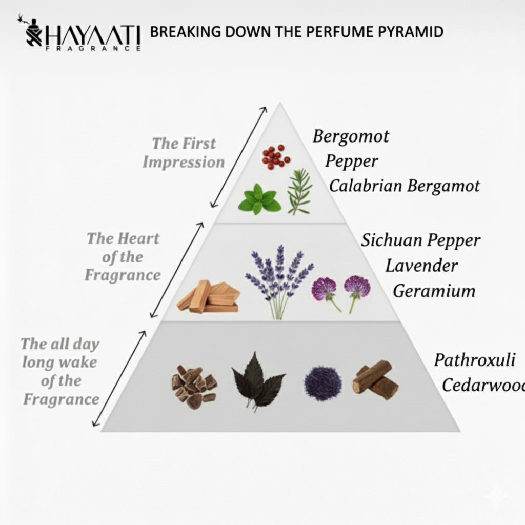 Sichuan Pepper, Lavender, Pink Pepper, Vetiver, Patchouli, Geranium, Elemi